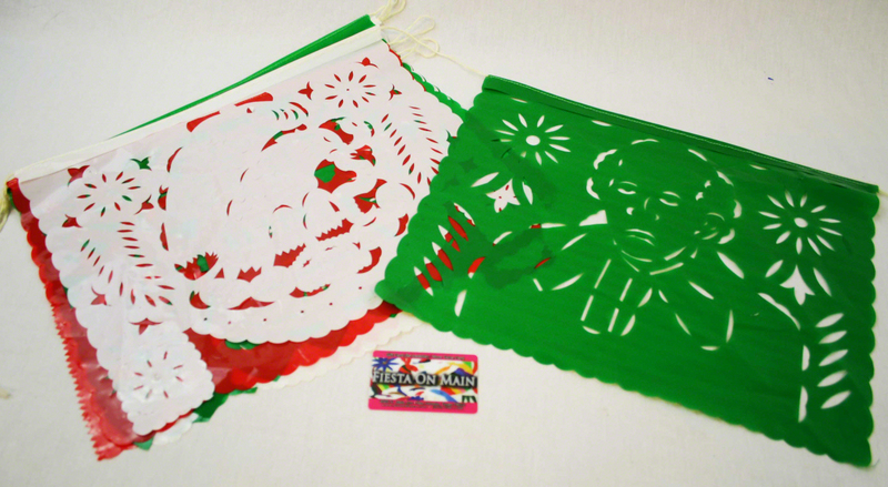 Plastic rectangular horizontal hanging decorations. Each banner is approx. 17x12 in. There are 10 banners strung together to make 18ft. long strand. Multiple banners can be hung strung together to make them longer or they can be cut to make the shorter. Can also use the individual banners just by cutting them. Each banner has a different design. Outside weather durable.